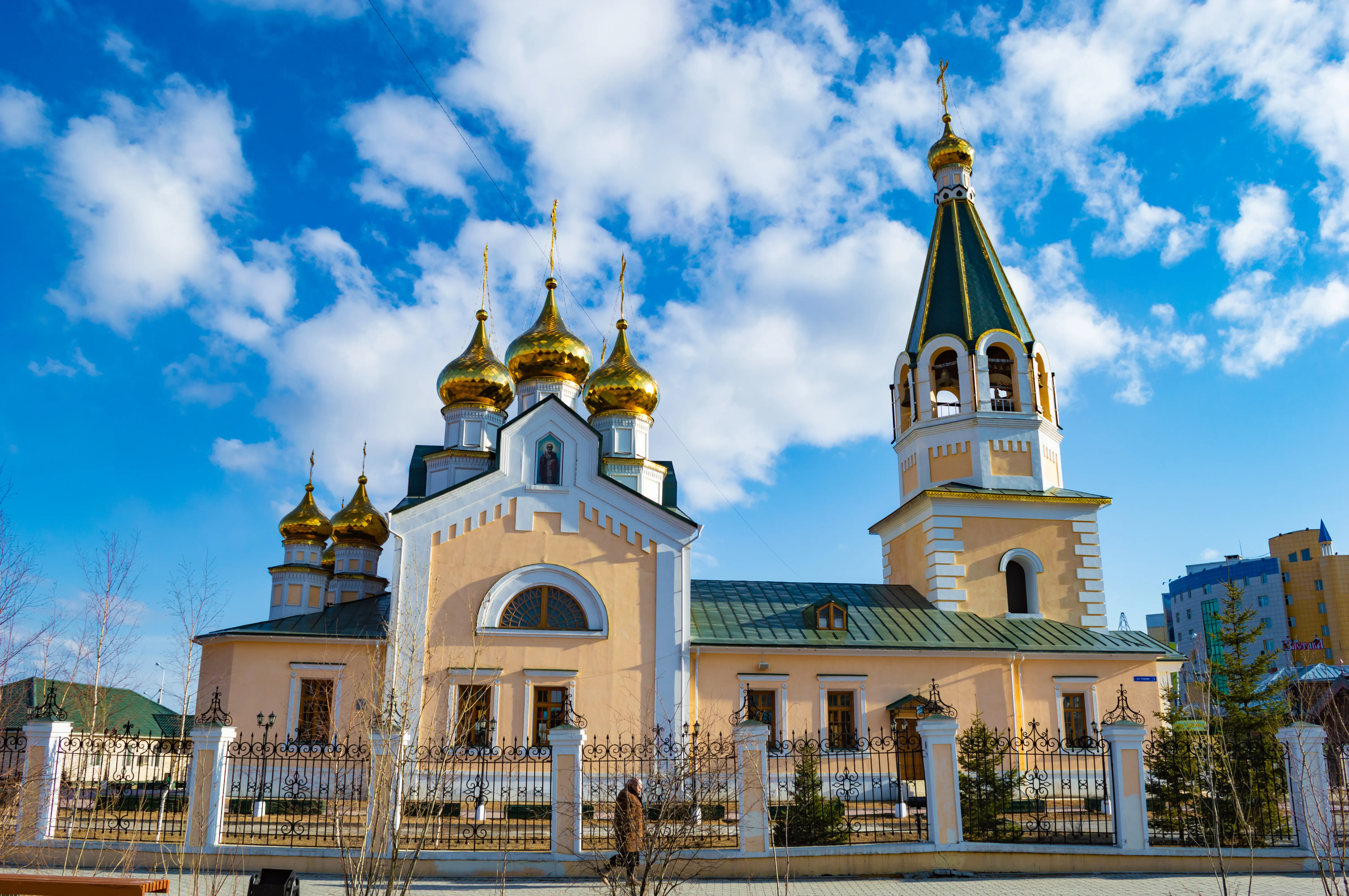 雅库特地区主要教堂之一 教堂的建设始于1826年,由雅库特一等商人的倡议发起,并于1846年完工。 如今这里保存着圣物,其中包括专门为该共和国在阿陀斯圣山绘制的圣母“万王之母”圣像。